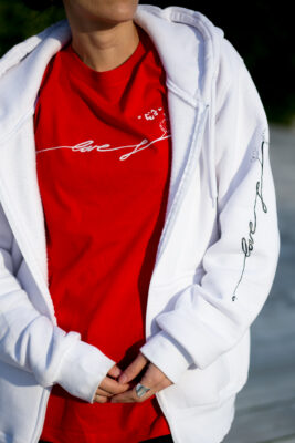 Την ιστορία με το Love Tattoo σας την έχω πει. Για τη νεραϊδούλα και την ευχή. Αλλά δε σας έχω πει πώς προέκυψαν οι παραλλαγές. Λοιπόν στην αρχή ξεκίνησα δειλά δειλά και συντηρητικά. Σκέφτηκα ένα λουλούδι μαύρο σε κατακόρυφη διάταξη έτσι ώστε να φαίνεται όταν αφήνεις ανοιχτό το μπουφάν ή τη ζακέτα σου. Πέρασαν κάπου έξι μήνες, και μια φίλη μου το ζήτησε σε μαύρο. “Θα του πήγαινε”, σκέφτηκα και το παρήγγειλα. Όμως στην εκτύπωση έγινε λάθος και το λουλούδι ήρθε οριζόντιο αντί κατακόρυφο . Αντί να διαφωνήσει, η Μαίρη ενθουσιάστηκε! Και εμένα μου άρεσε. Και έτσι το διατήρησα. Ώσπου τα Χριστούγεννα σκέφτηκα να το δοκιμάσω σε κόκκινο.