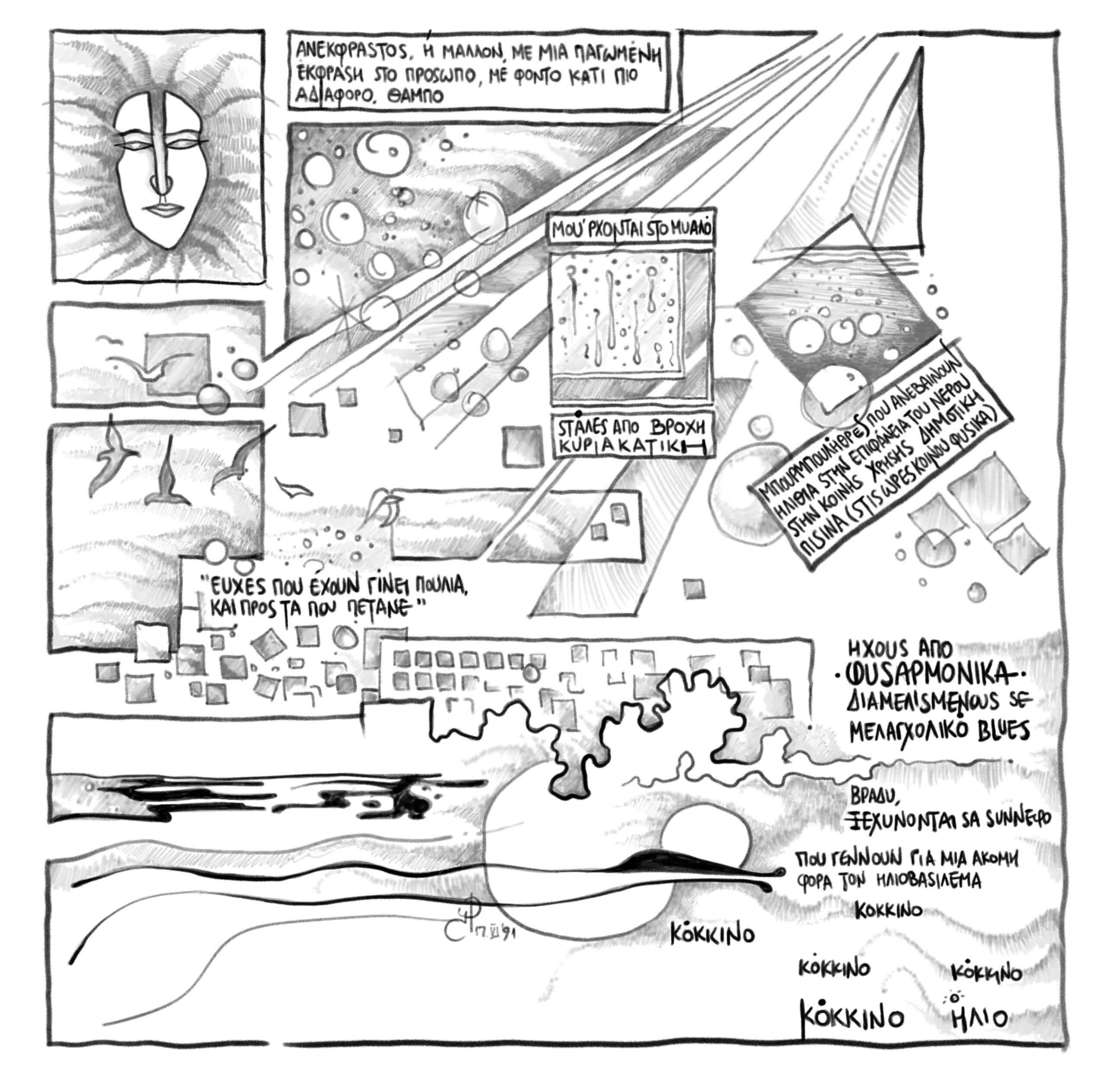 Η «Φυσαρμόνικα» είναι μια ιστορία νερού (πάλι). Έλκει την καταγωγή της από τότε που πήγαινα στο (δημοτικό) κολυμβητήριο της Νέας Σμύρνης στα διαλείμματα διαβάσματος σε εξετάσεις του Πολυτεχνείου, στις ώρες κοινού φυσικά. Είναι μια μίξη από σκέψεις την ώρα που κολυμπάω και ξέρω ότι έξω βρέχει, ή όταν είναι στο δωμάτιό μου την Κυριακή, έξω βρέχει και σκέφτομαι την πισίνα. Γι’ αυτό και όπως γράφω «μού’ ρχονται στο μυαλό στάλες από βροχή κυριακάτικη». Ακούω Στερεονόβα και «ευχές που έχουν γίνει πουλιά και προς τα πού πετάνε». Τελειώνει ο δίσκος και βάζω ν’ ακούσω καθαρόαιμο μπλουζ. Τα ίχνη που άφησαν πίσω τους οι Στερεονόβα φεύγοντας μπλέκουν με τη φυσαρμόνικα των μπλουζ του Σικάγο και όλο αυτό το μπλέξιμο εικόνων και ήχων Κυριακή χάνονται ξεμακρύνοντας «σα σύννεφο που γεννούν τον ηλιοβασίλεμα κόκκινο κόκκινο κόκκινο Ήλιο»