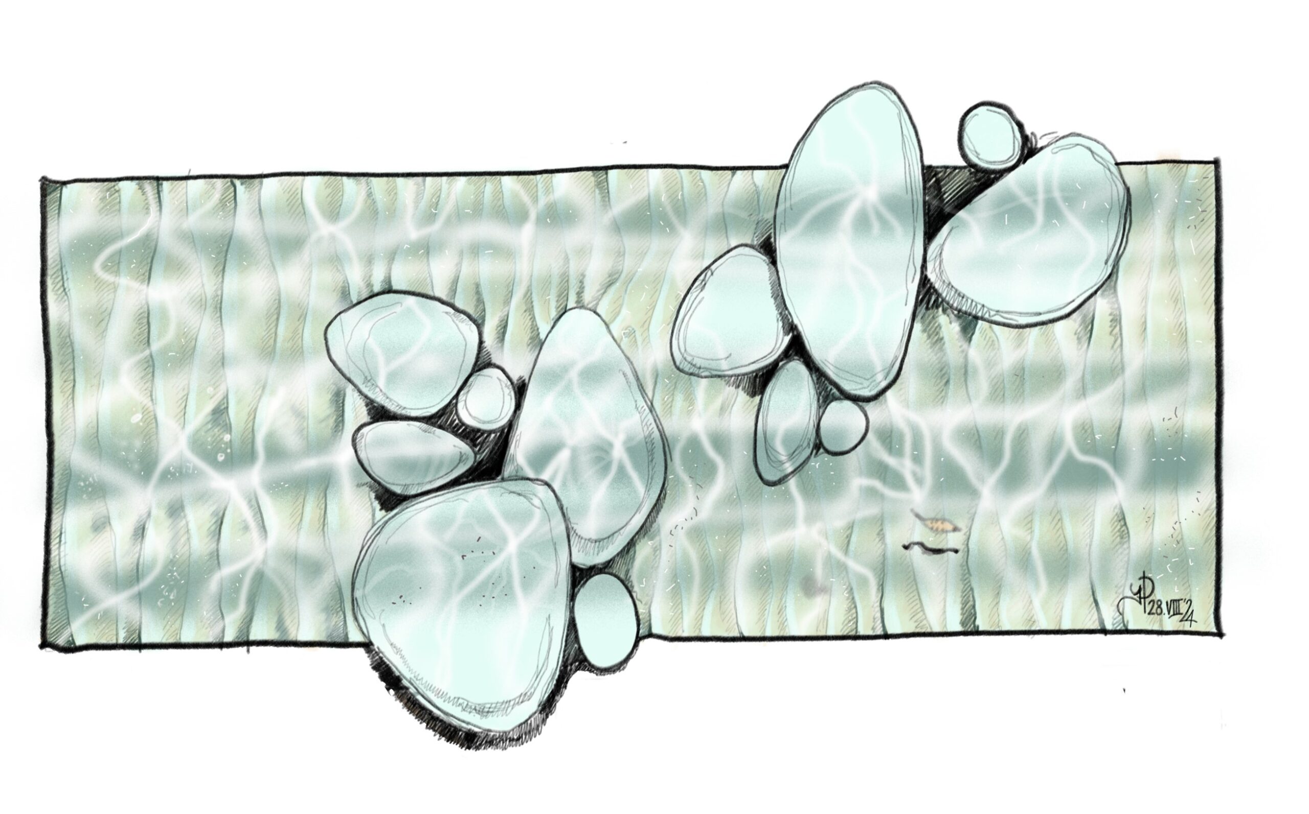 Πάντα έβρισκα συναρπαστικό τον τρόπο με τον οποίο το φως πέφτει στα κύματα της θάλασσας, φιλτράρεται από τις μορφές του φουσκώματος του νερού και αφήνει τα ίχνη του επάνω στα Όρη και τις κοιλάδες του αμμώδους πυθμένα. Εδώ το θέμα μου ήταν το φως, το νερό και η άμμος. Κολυμπούσα ξανά και ξανά προσπαθώντας να το καταλάβω, και μετά έβγαινα και έκανα σκίτσο για να δω πώς σχηματίζονταν οι μορφές. Η χαριτωμένη πινελιά είναι ένα ψαράκι, στα δεξιά του σκίτσου, που εμφανίζεται σε κάτοψη σχεδόν, από πάνω προς τα κάτω δηλαδή, και αφήνει τη σκιά του στην άμμο. Η θάλασσα αυτή ΕΙΝΑΙ ο Άγ.Ρωμανός.