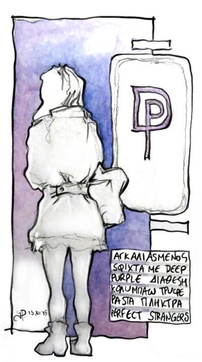 Το τραγούδι των Deep Purple, “Perfect Strangers” είναι ο πρωταγωνιστής της σκέψης που εκδηλώνεται σε ένα κλειστό ερμητικά μέρος, μέσα στο συρμό του μετρό που πηγαίνει στο Χαλάνδρι. Σε μια στιγμή χωρίς πλαίσιο, χωρίς πριν και μετά, σε ένα τοίχωμα περιοριστικό, η σκέψη είναι το όχημα της στιγμιαίας απόδρασής μου. Η πόρτα του συρμού στα δεξιά, με το λογότυπο του αγαπημένου μου συγκροτήματος.