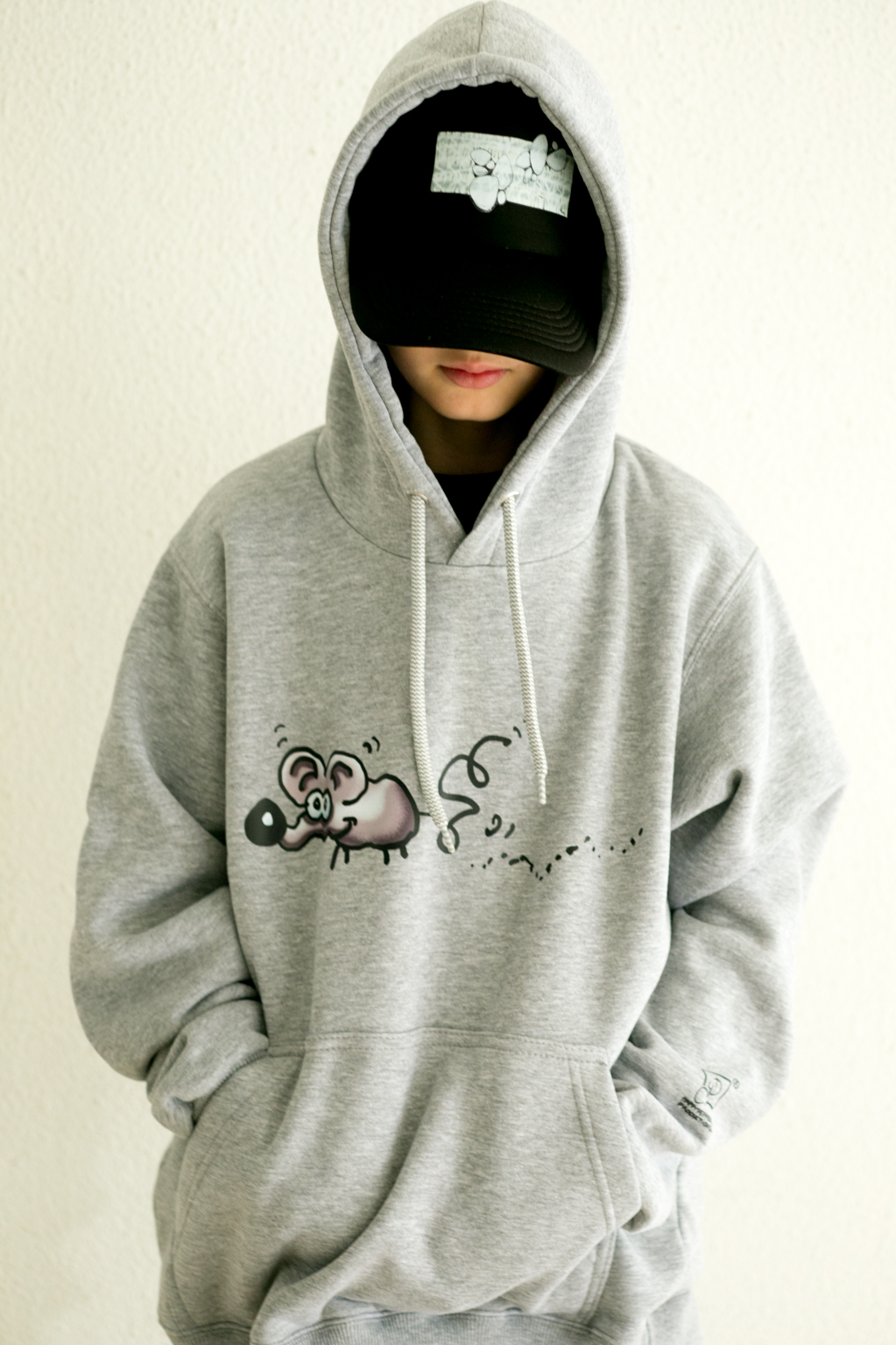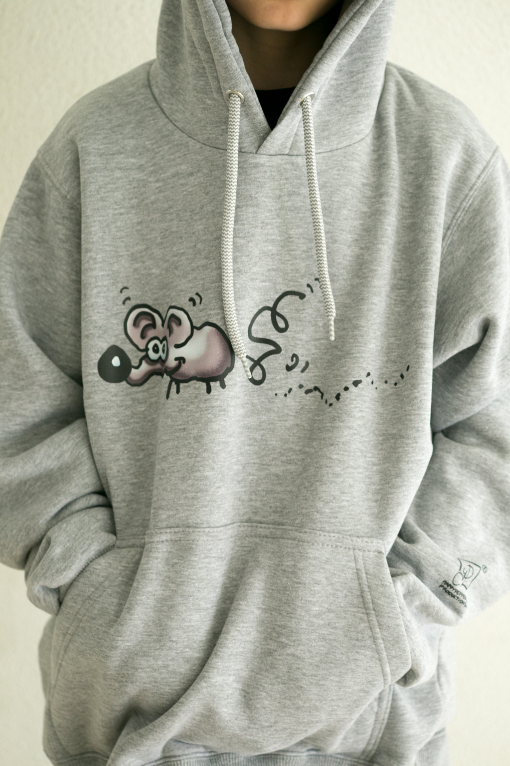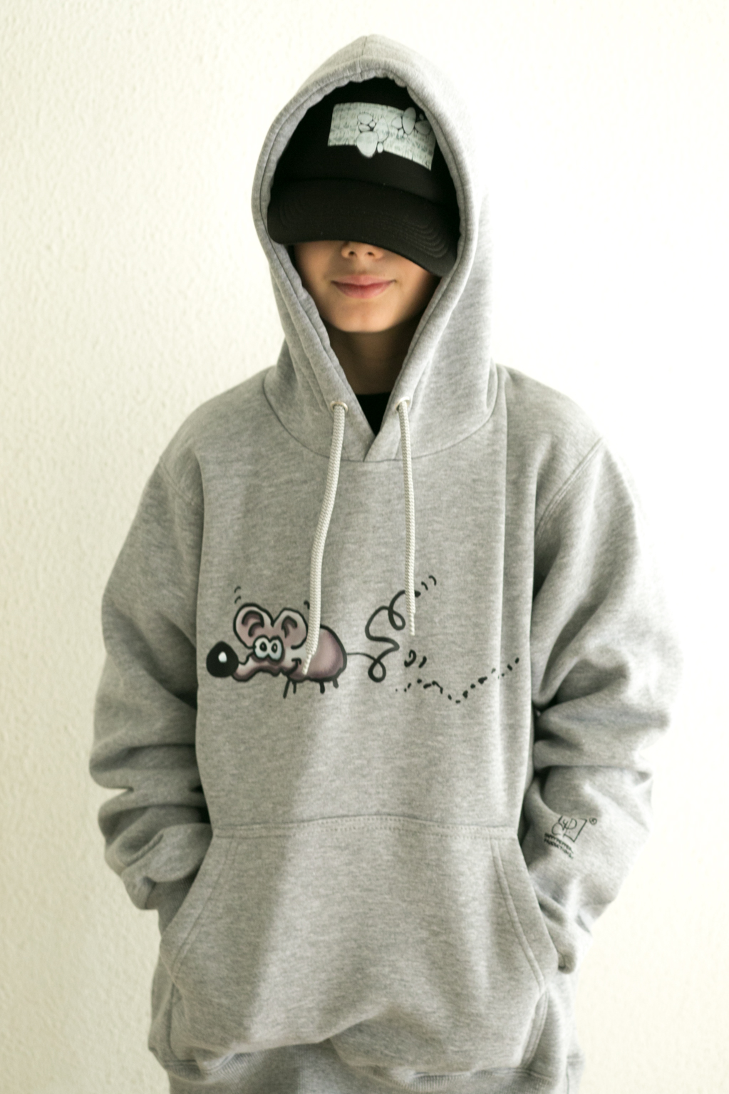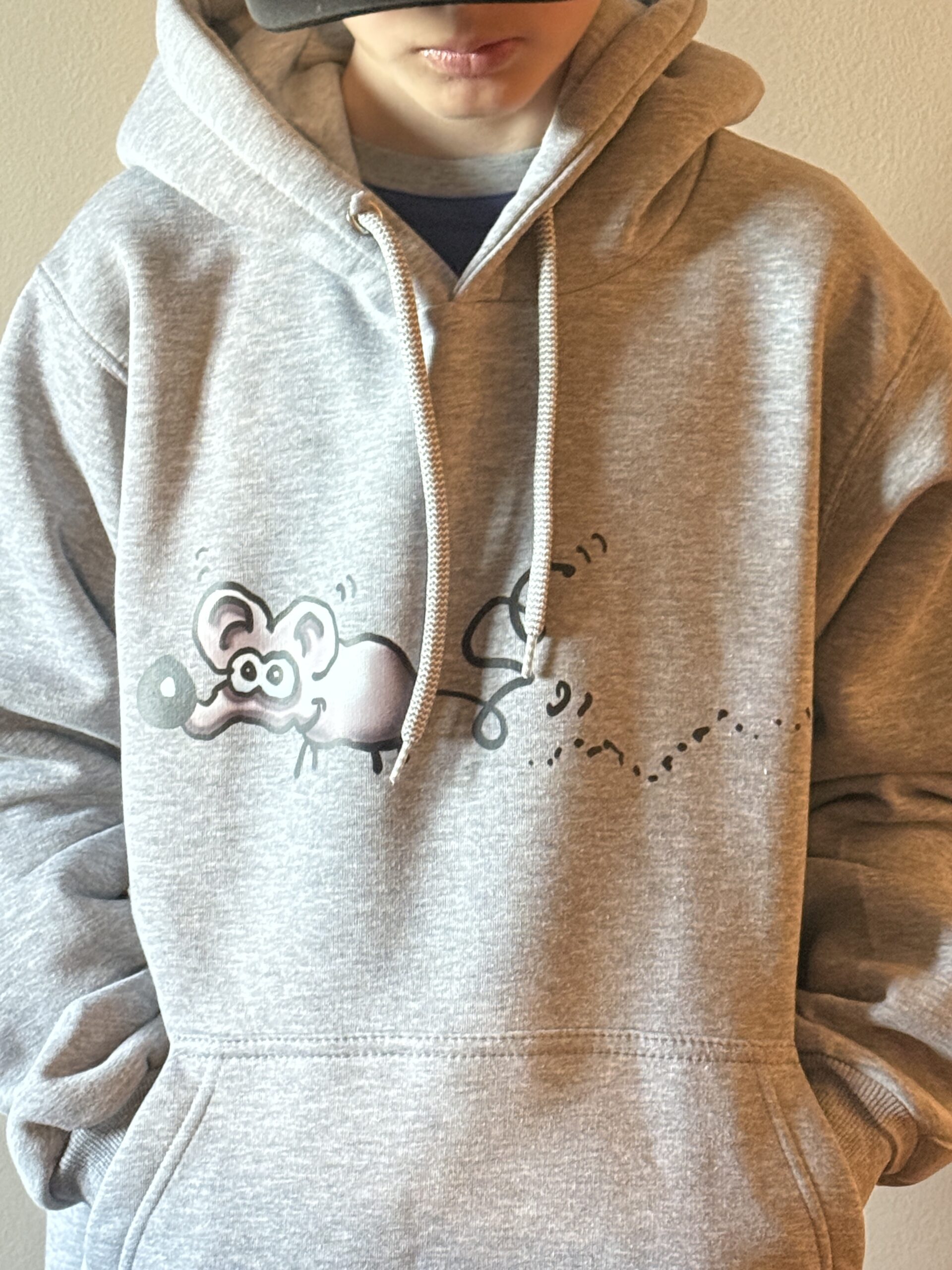 Φούτερ με κουκούλα, σε γκρι χρώμα, με σχέδιο Ποντικός, από τον Χάρη Παπαϊωάννου. Εμπνευσμένο από έναν σκανταλιάρη ποντικό που ονειρεύτηκε ένα παιδί.