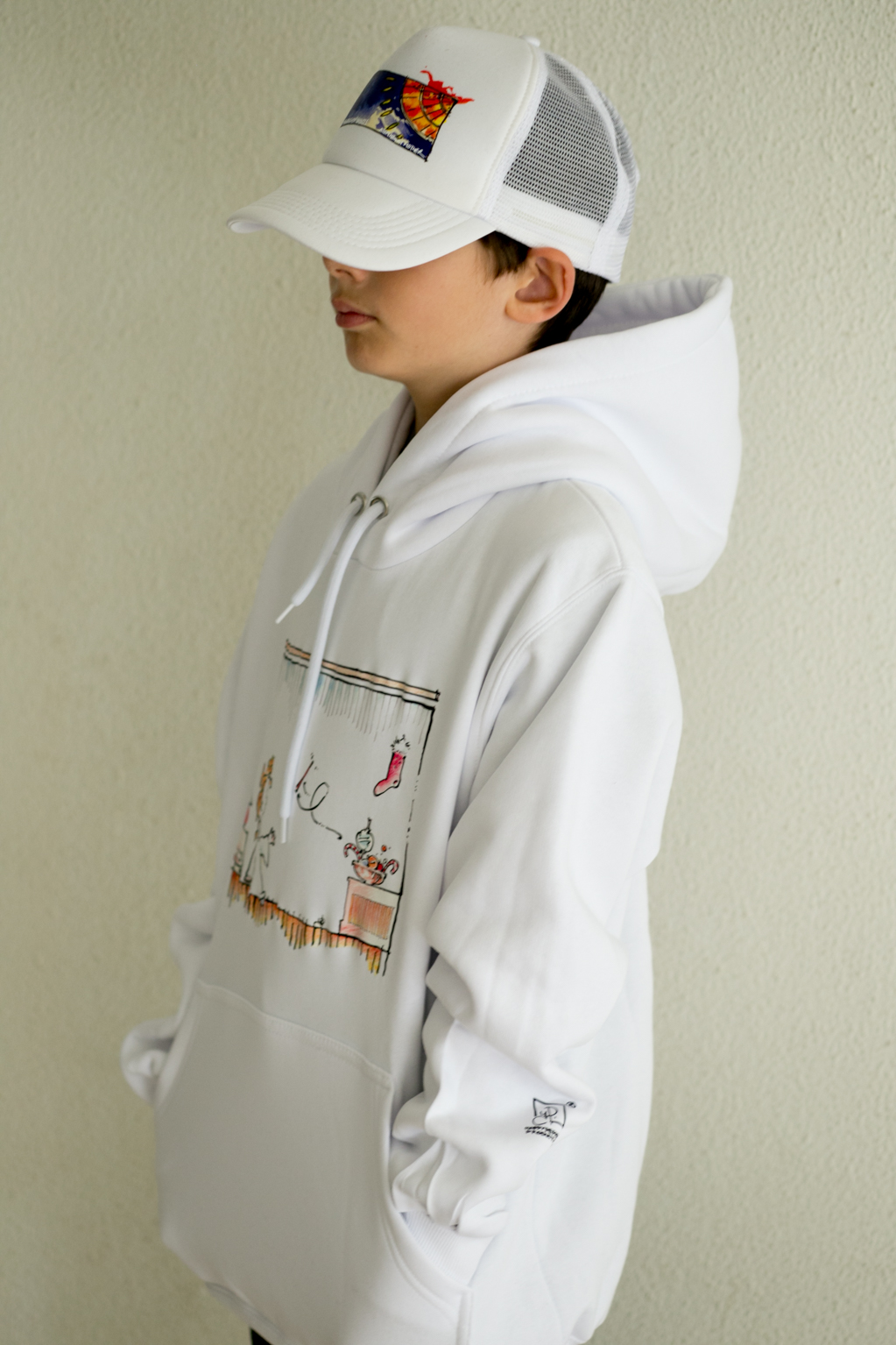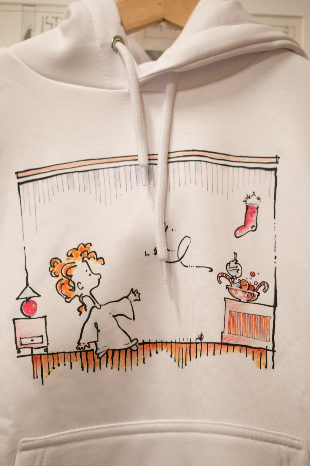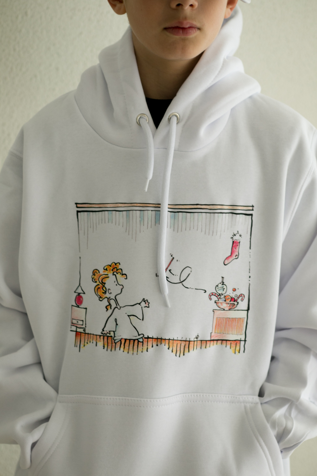 Φούτερ με κουκούλα, σε λευκό χρώμα, με σχέδιο Sonja 1, από τον Χάρη Παπαϊωάννου. Εμπνευσμένο από ένα κοριτσάκι που ονειρευόταν συνεχώς να αλλάξει τον κόσμο.