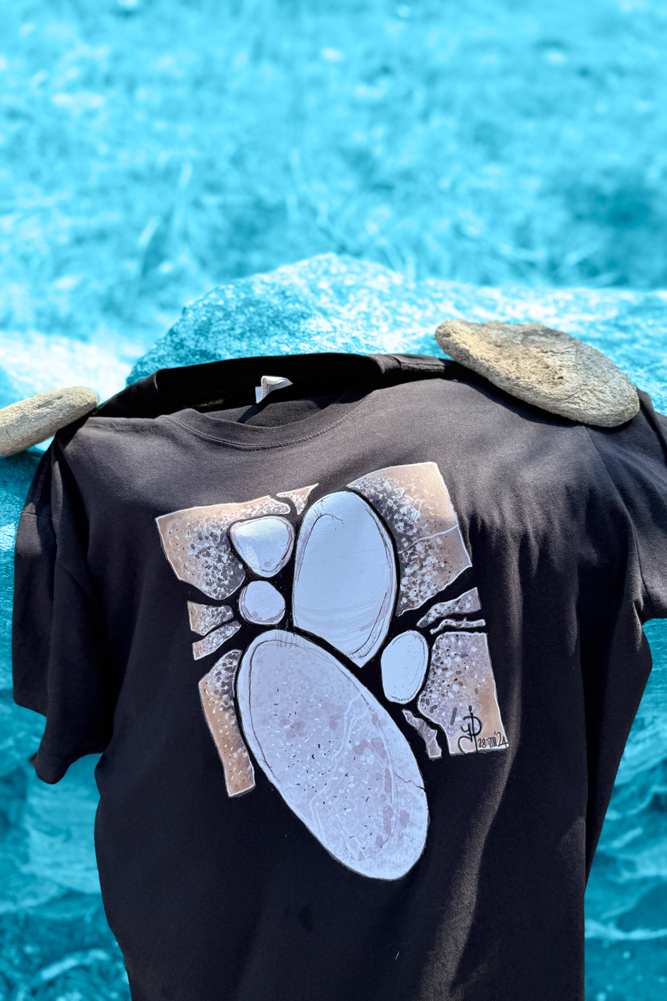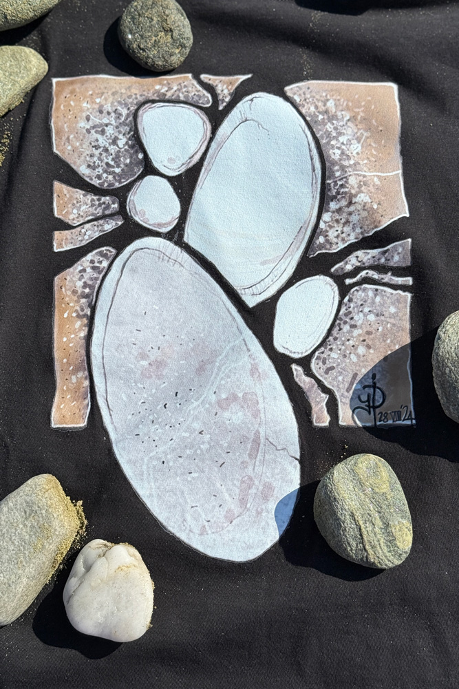 Μαύρο βαμβακερό T-Shirt, με σχέδιο Βότσαλα και στις δύο όψεις, από τον Χάρη Παπαϊωάννου. Εμπνευσμένο από τα σμιλεμένα βότσαλα της παραλίας του Αγίου Ρωμανού Τήνου, με τη μαύρη άμμο που αστροποβολάει…